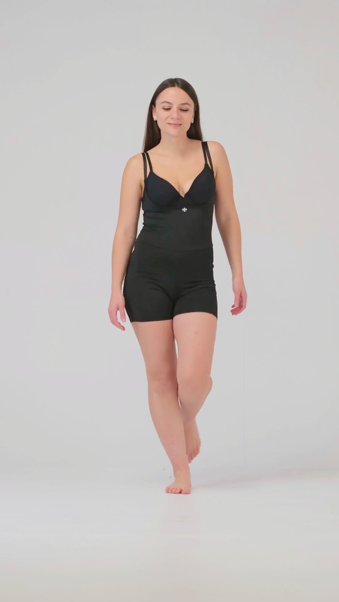 Balanced compression through upper and lower belly with lift for bust and booty — no flattening, full back support.